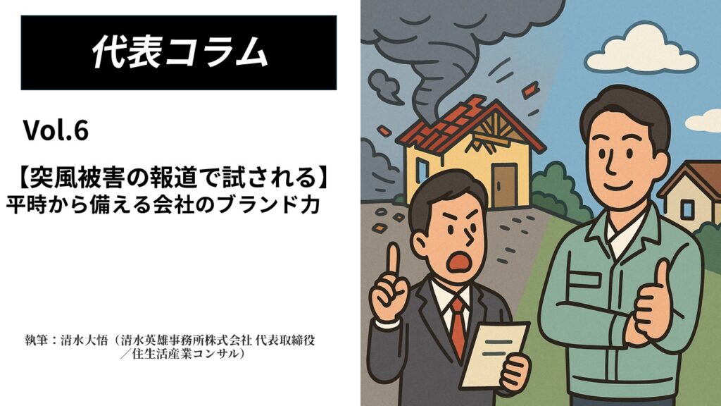 災害の報道が増える時期、会社の姿勢は顧客に必ず見透かされます。ニュースを利用してあおるのか、黙ってやり過ごすのか、あるいは平時からの備えをベースに誠実に伝えるのか――その違いは顧客の目に鮮明に映ります。日常から暮らしを守る提案を一貫して行う会社こそが、信頼されるブランドを築いていけるのです。