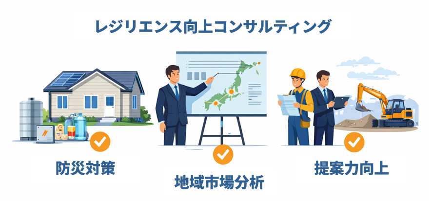 レジリエンス住宅のメニュー構築や販売支援については、具体的な進め方や支援内容を整理したページも用意しています。